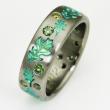 Titanium ring with oak leaves and 16 enhanced green diamonds: four 5-point, four 4-point, three 3-point, and five 2-point. Price will vary depending on number and size of diamonds.